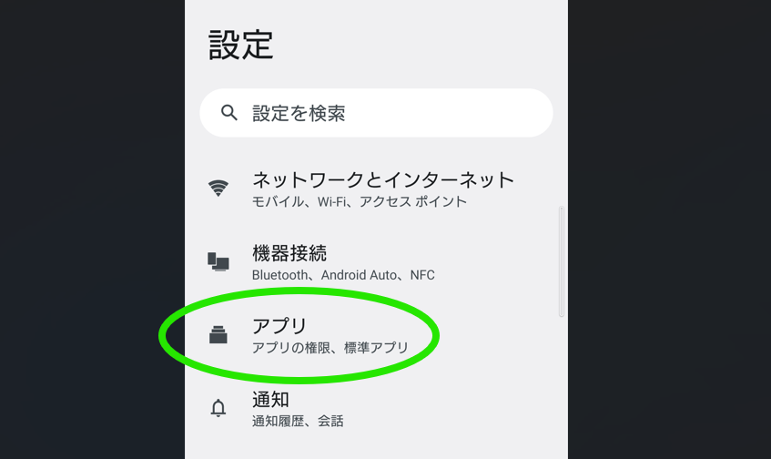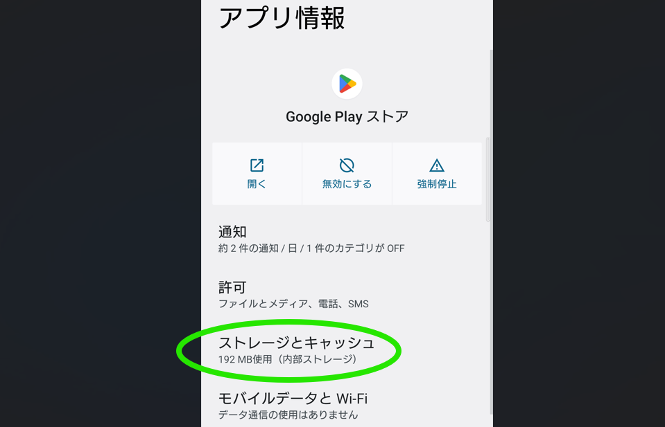 というわけで、「設定」から「アプリ」、そして「Google Play ストア」へ進み、「ストレージとキャッシュ」をタップします。