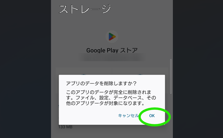 「アプリのデータを削除しますか? このアプリのデータが完全に削除されます。ファイル、設定、データベース、その他のアプリデータが対象になります。」