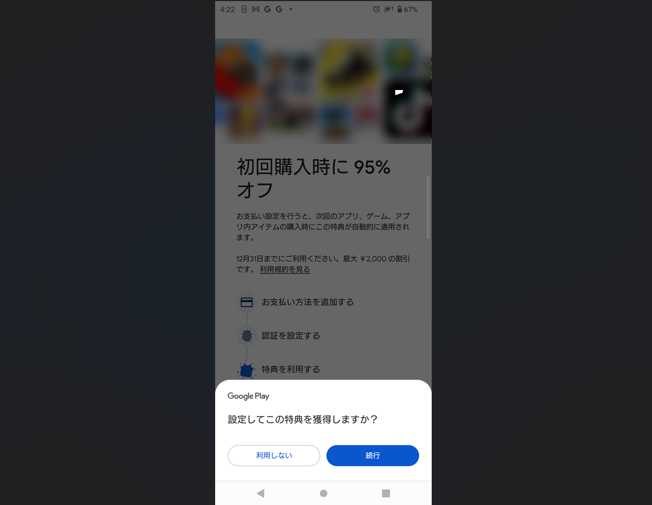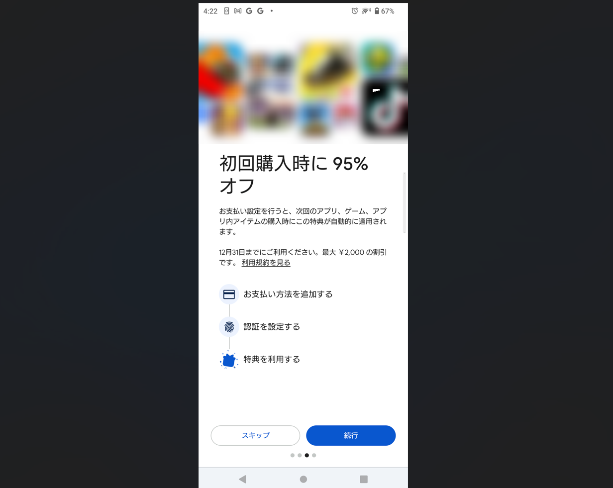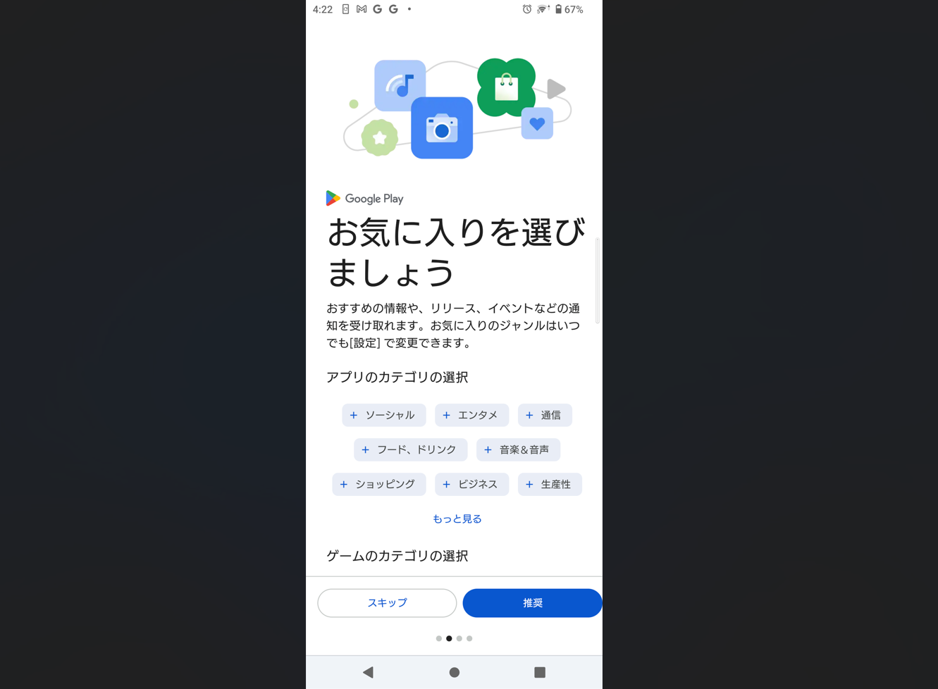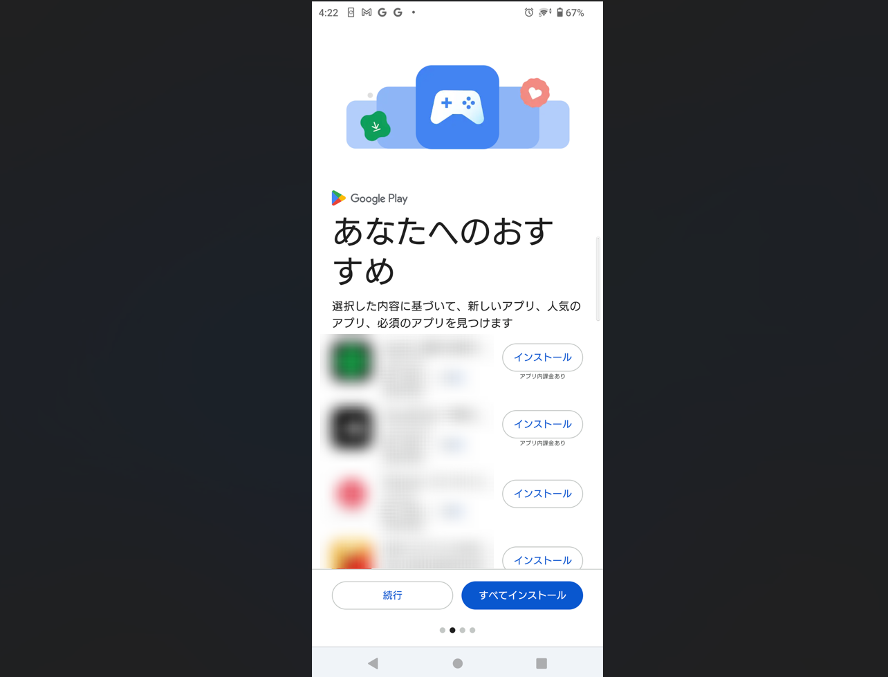 スキップしたはずなのに、なぜか「あなたへのおすすめ」アプリが表示されますね。デフォルトみたいなものが有るのかもしれません。