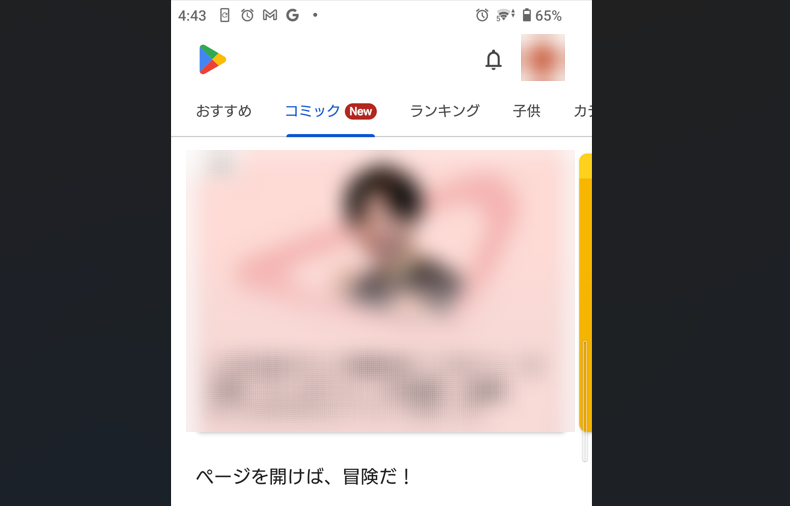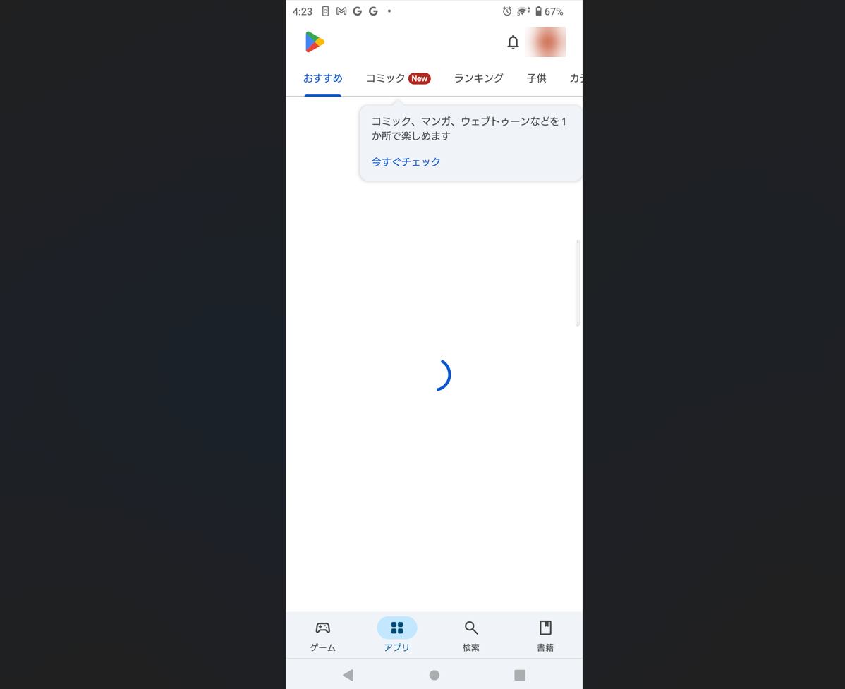 実は、その後もくるくる回っていまして、試しに「コミック」をタップしたら、何やら表示されました。