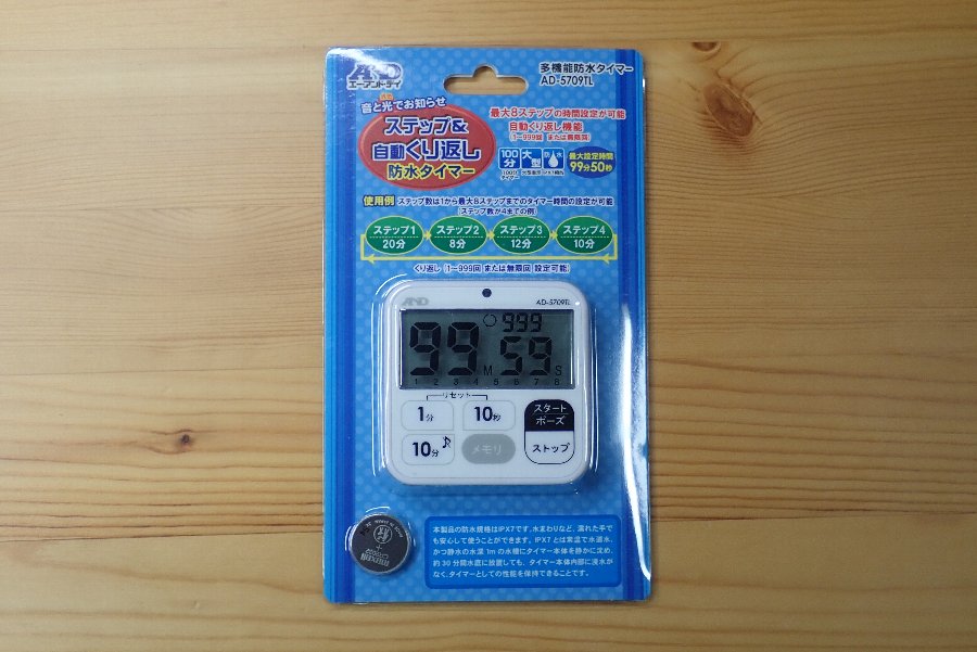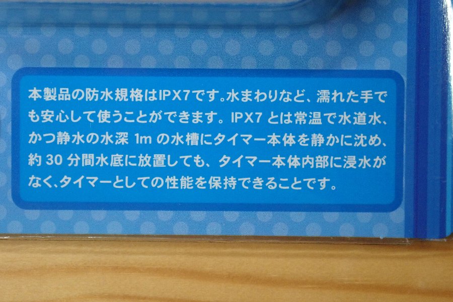 購入する時は気が付かなかったのですが、なんと、「防水タイマー」です。IPX7ということで、水まわりなど、濡れた手でも安心して使うことができるとのこと。