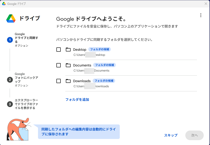 デフォルトで、デスクトップ、ダウンロード、ドキュメントフォルダは設定できるようになっていますので、それらのフォルダをGoogle ドライブと同期するだけであれば、チェックを入れるだけで同期してくれます。