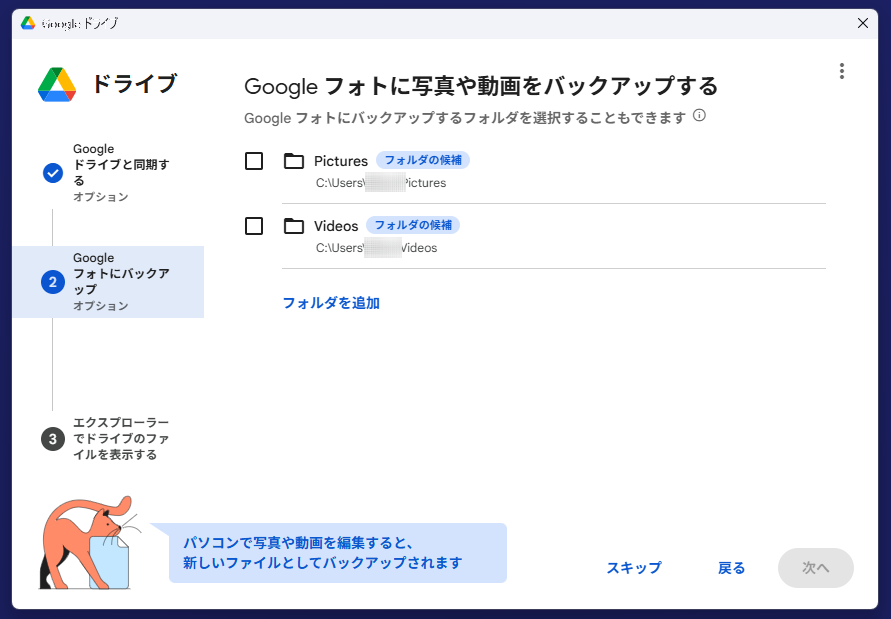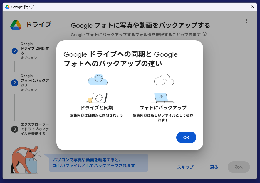 初回だけですが、「Google フォトにバックアップ」というオプションも確認されますが、今回、テキストファイルなどを同期したいので、「OK」だけ押して、進みます。