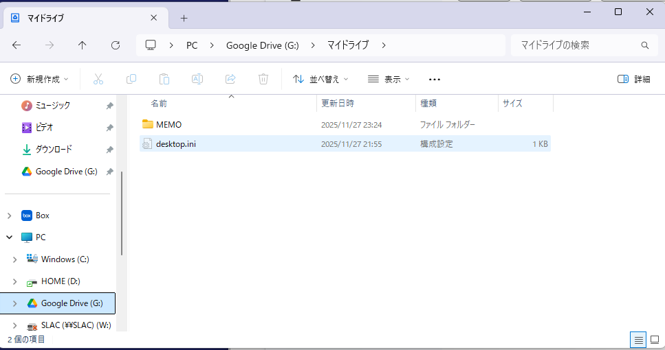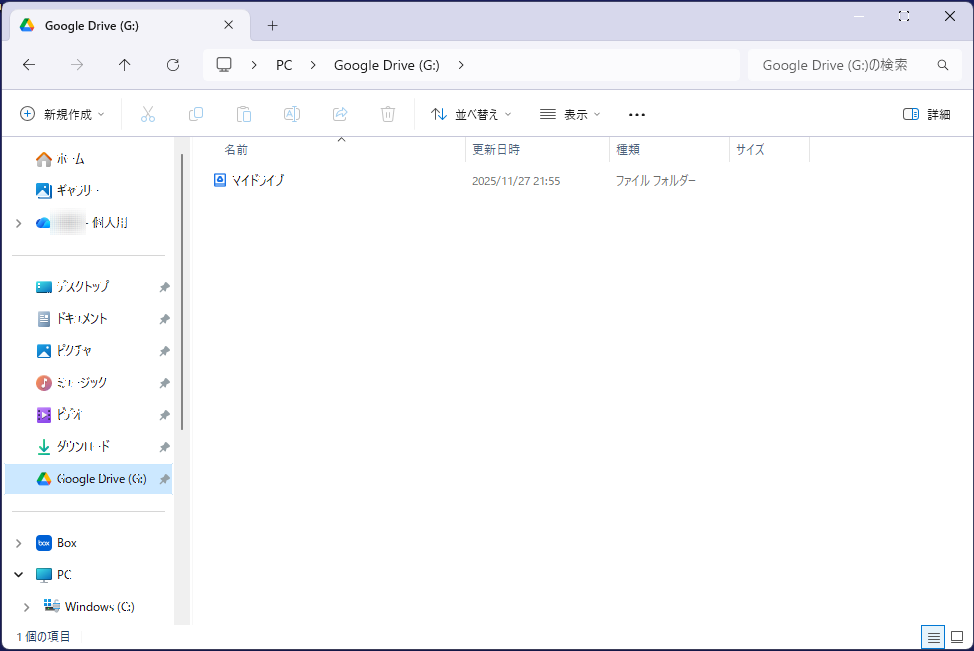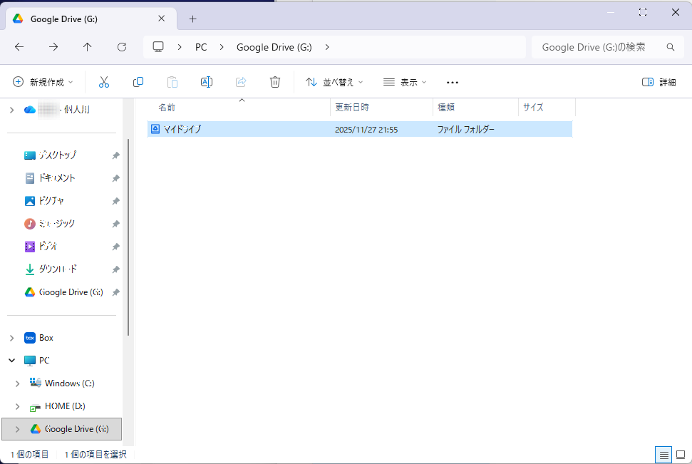 今度は、Windows11の「Google Drive (G:)」の方です。ちゃんと反映されています。なるほどなるほど、いい感じです。
