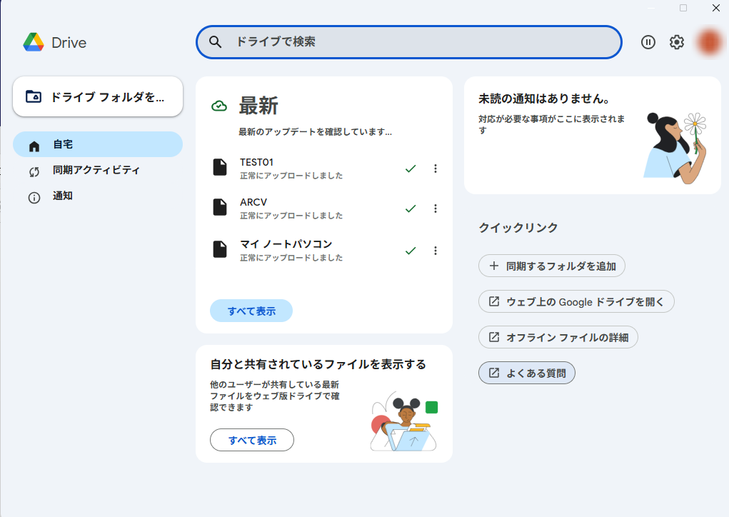 管理画面風のGoogle Drive on Desktop、ウインドウを閉じてみましたが、ちゃんとファイルは同期してくれています。