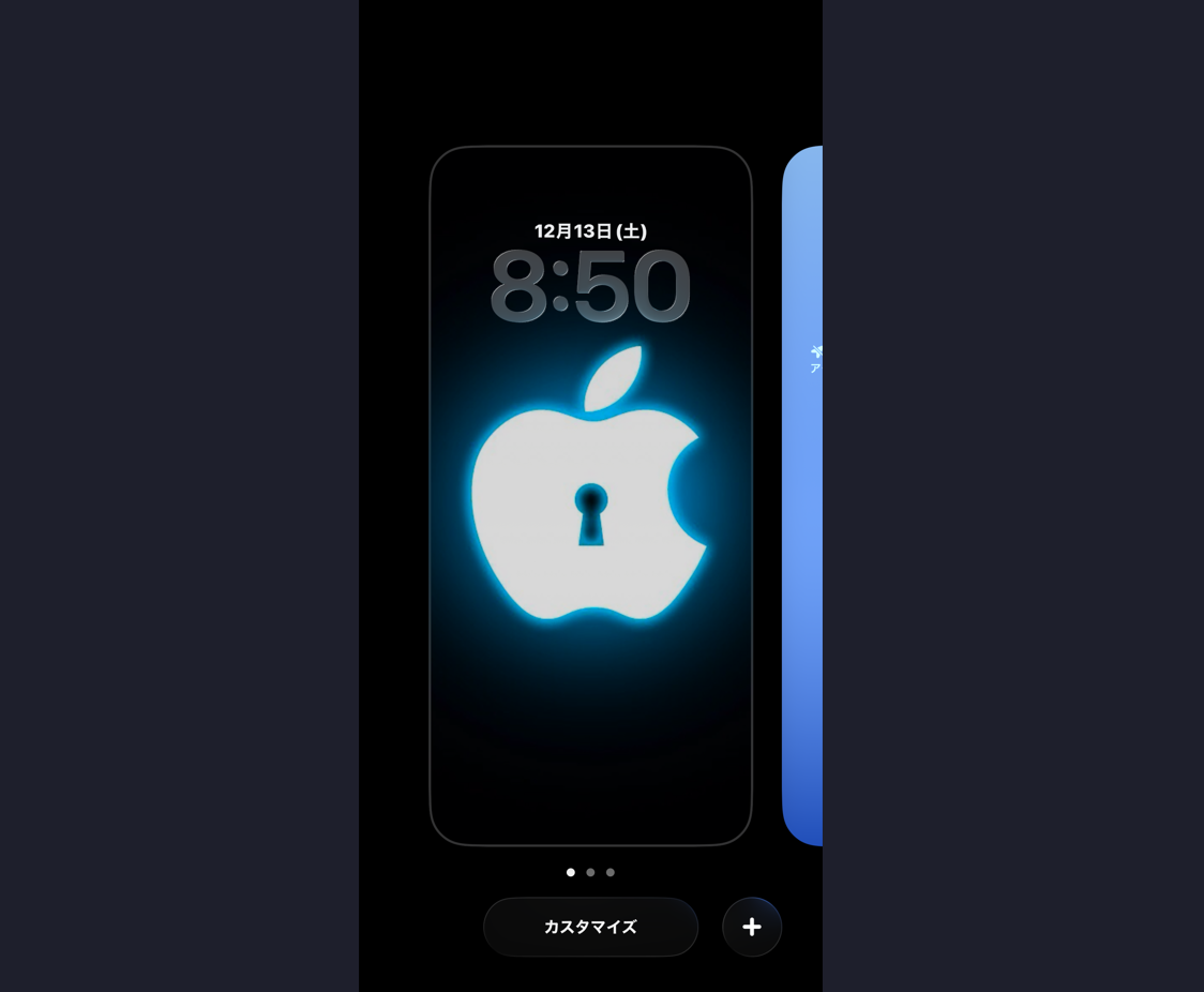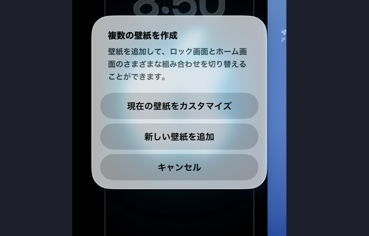 「現在の壁紙をカスタマイズ」、「新しい壁紙を追加」、「キャンセル」のボタンが表示されますので、「現在の壁紙をカスタマイズ」をタップします。