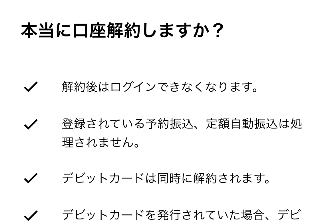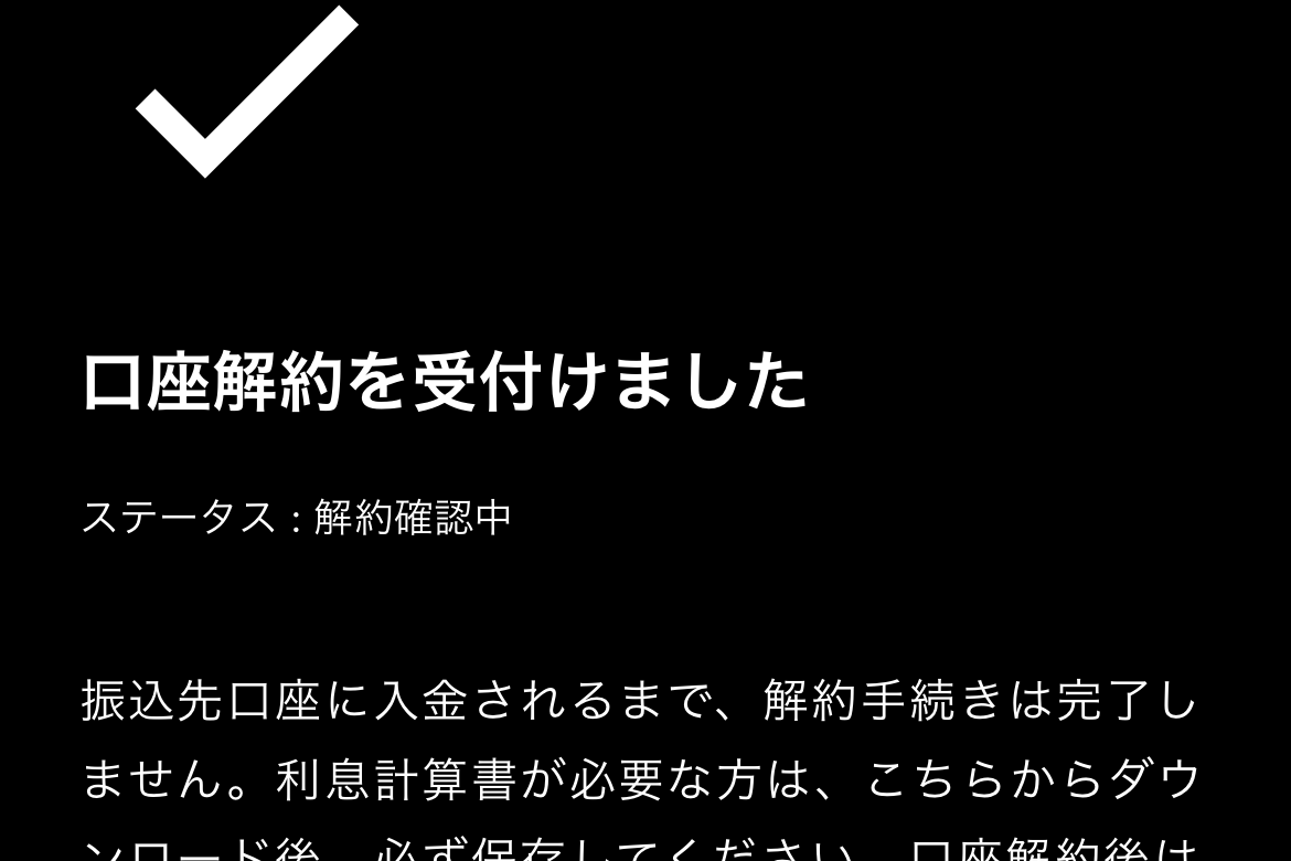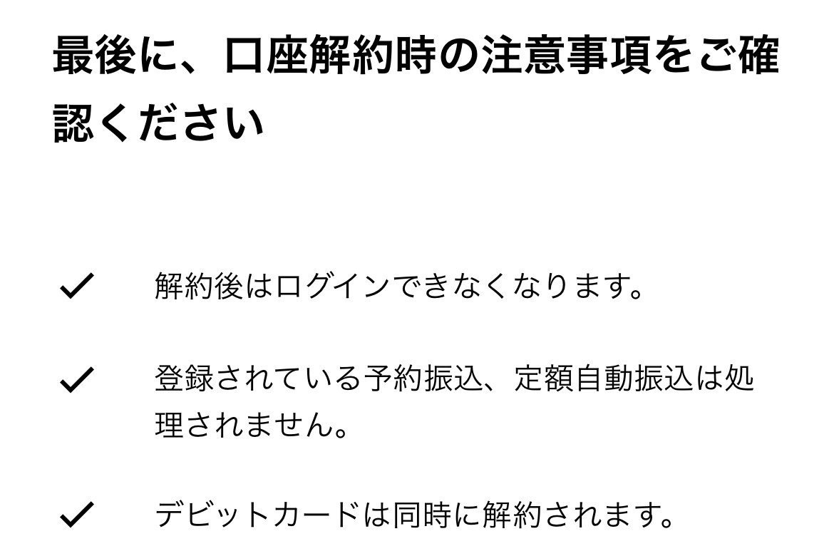 最後の最後に、「最後に、口座解約時の注意事項をご確認ください」と表示され、あれこれ丁寧に説明してくれます。ほどほどの量ってのがありがたいです。