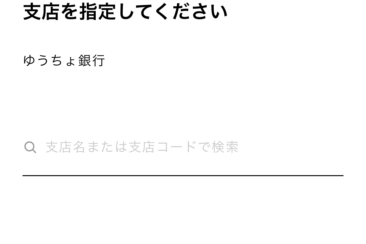 支店を指定します。ゆうちょ銀行の場合、支店名が「漢数字」なので、探すの、意外と面倒です…。