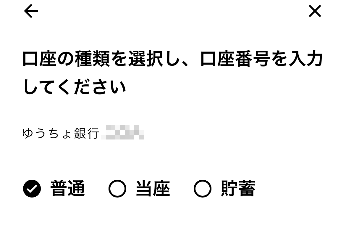 そして、「口座の種類」と「口座番号」を入力します。ほとんどの場合、「口座の種類」は「普通」です。