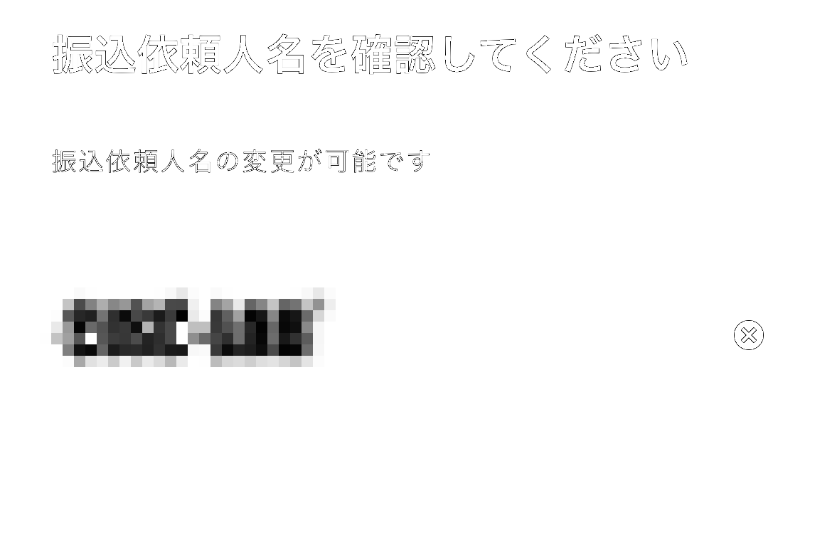 今度は、「振込依頼人名」の入力になります。振込先で判別が付けばいいので、なんでもいいですが、まあ、自分の名前にしておきます。