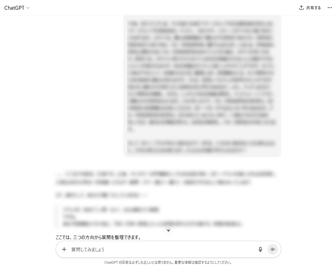 ChatGPT(無料の5.0)の場合、上記画像のように、あっさりと長文を受け入れてくれました。プライベートで、かつ無料で生成AIを使うのであれば、Microsoft CopiotとChatGPTを比較した場合、ChatGPTの方が優勢かもしれません。