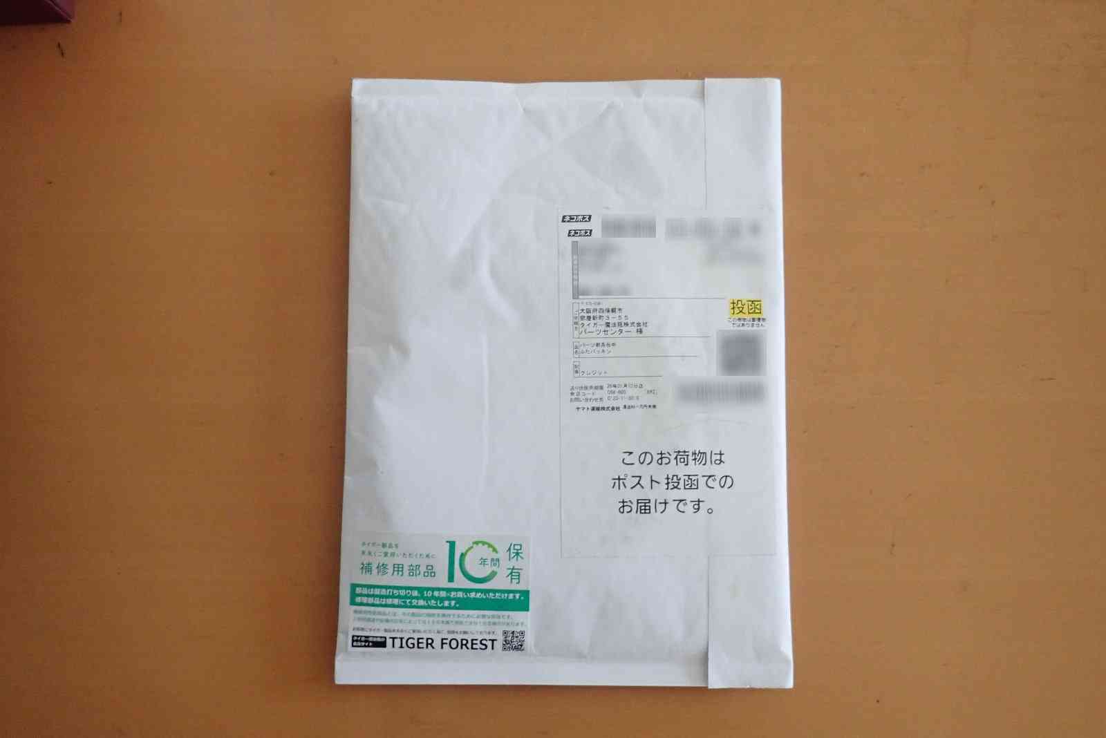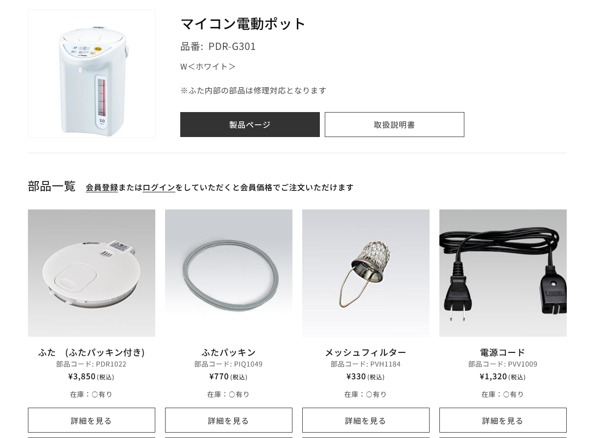 パッキン交換は簡単なので、紹介します。パッキンは電気屋さんに取り寄せてもらってもいいのですが、タイガーのホームページからも購入することができます。