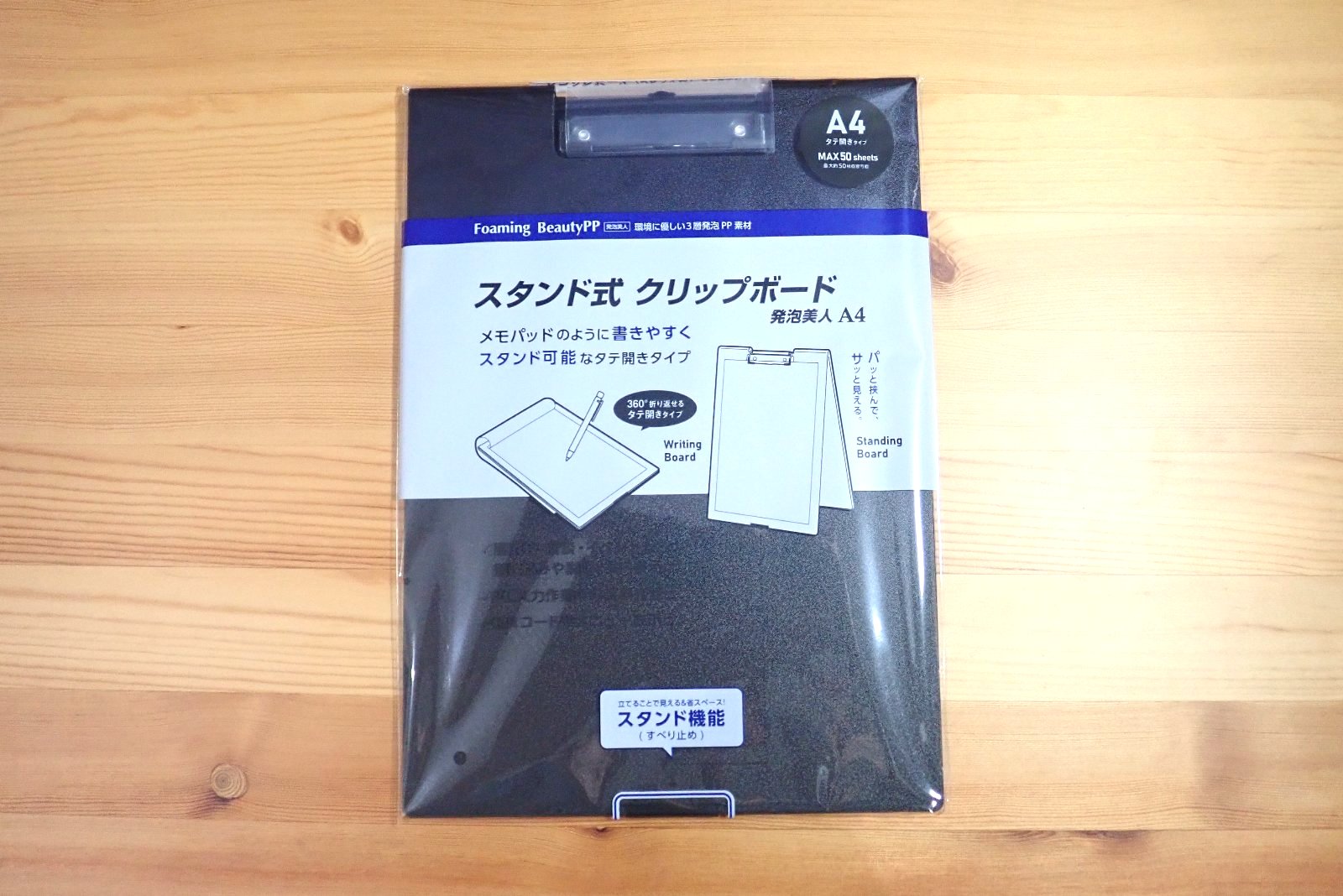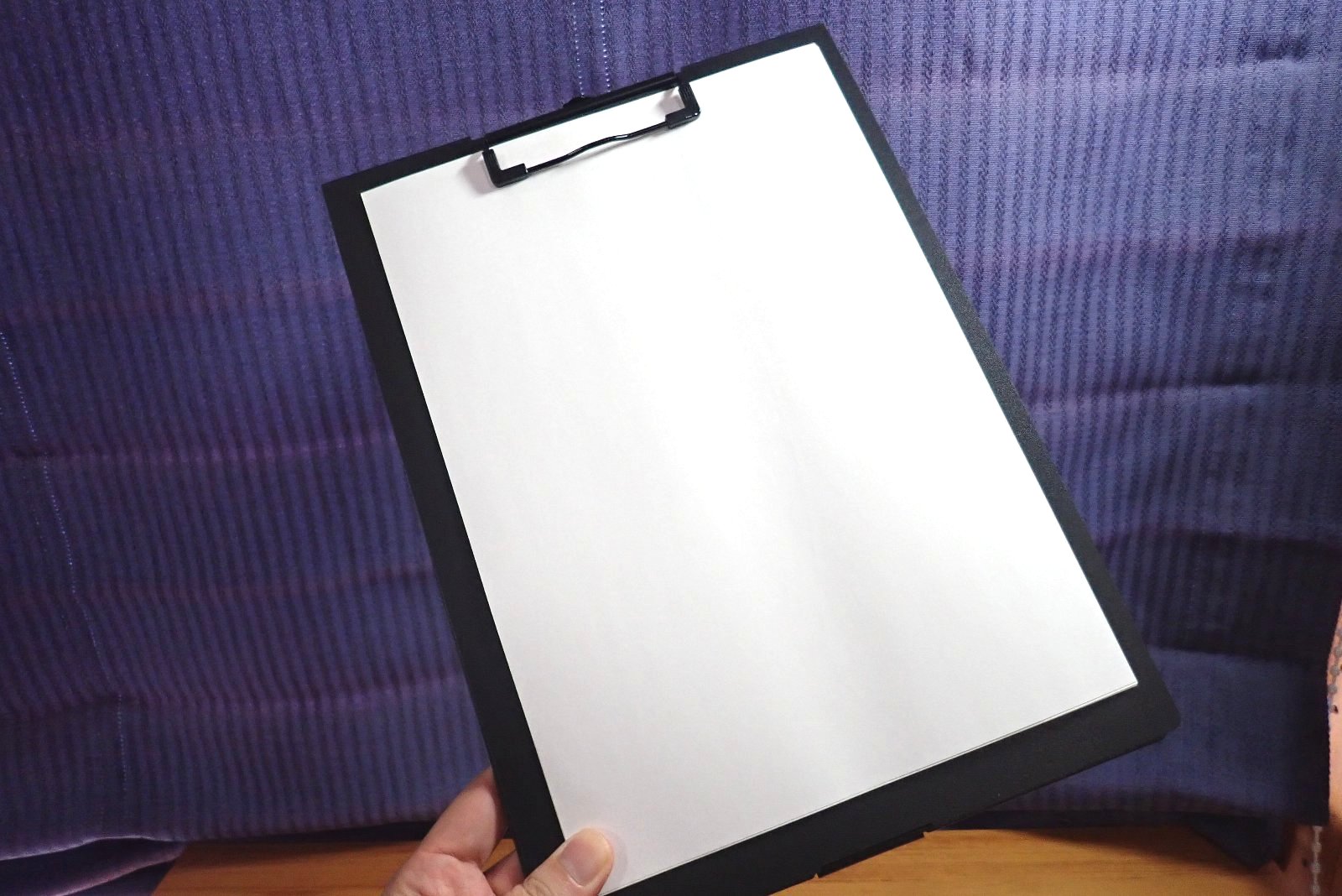 珍しい!縦に開くA4クリップボードを購入しました。滑り止めも付いているため、看板みたいに立てて、他の人に図を書いたりしながら説明するのにも最適です。しかも、バッグに押し込んでも、紙がくしゃくしゃにならない優れものです。