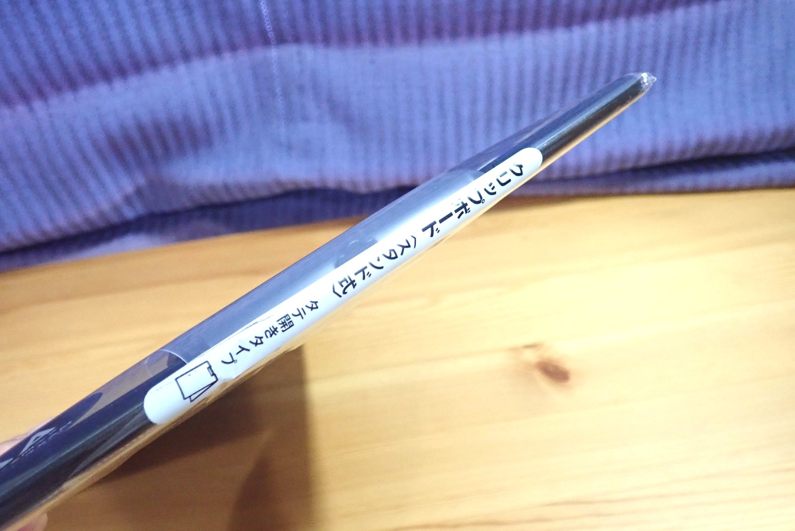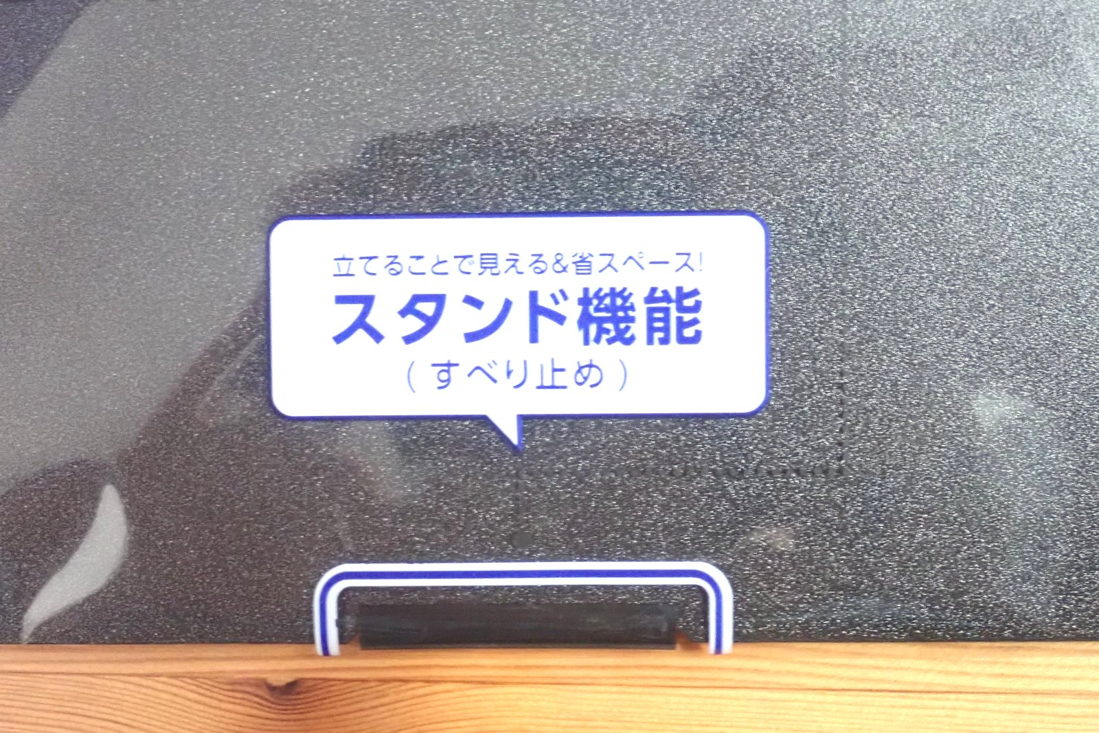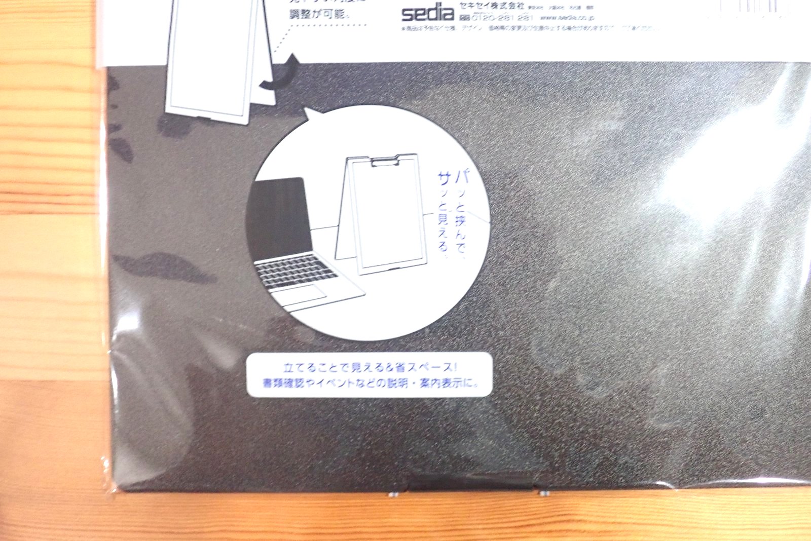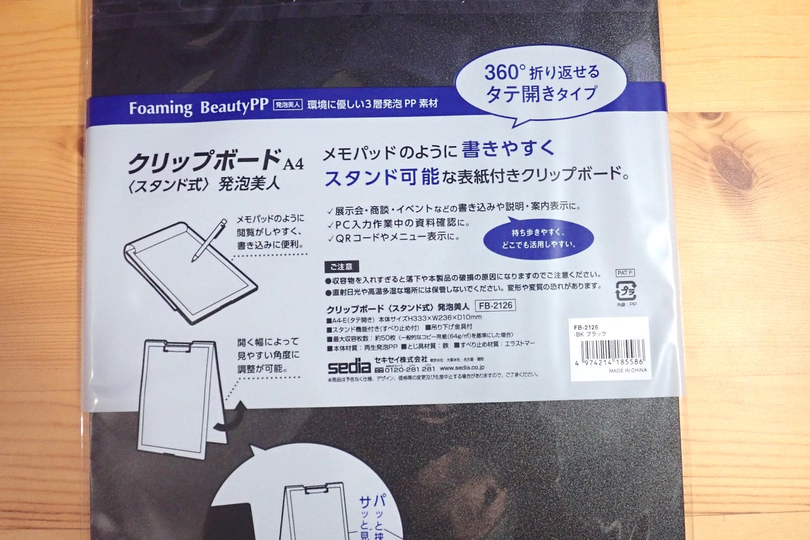 お、これ、印刷、頑張ってますね! 本で言うところの背表紙部分にも「クリップボード<スタンド式>タテ開きタイプ」と、スタンドにした時のイラストが印刷されています。