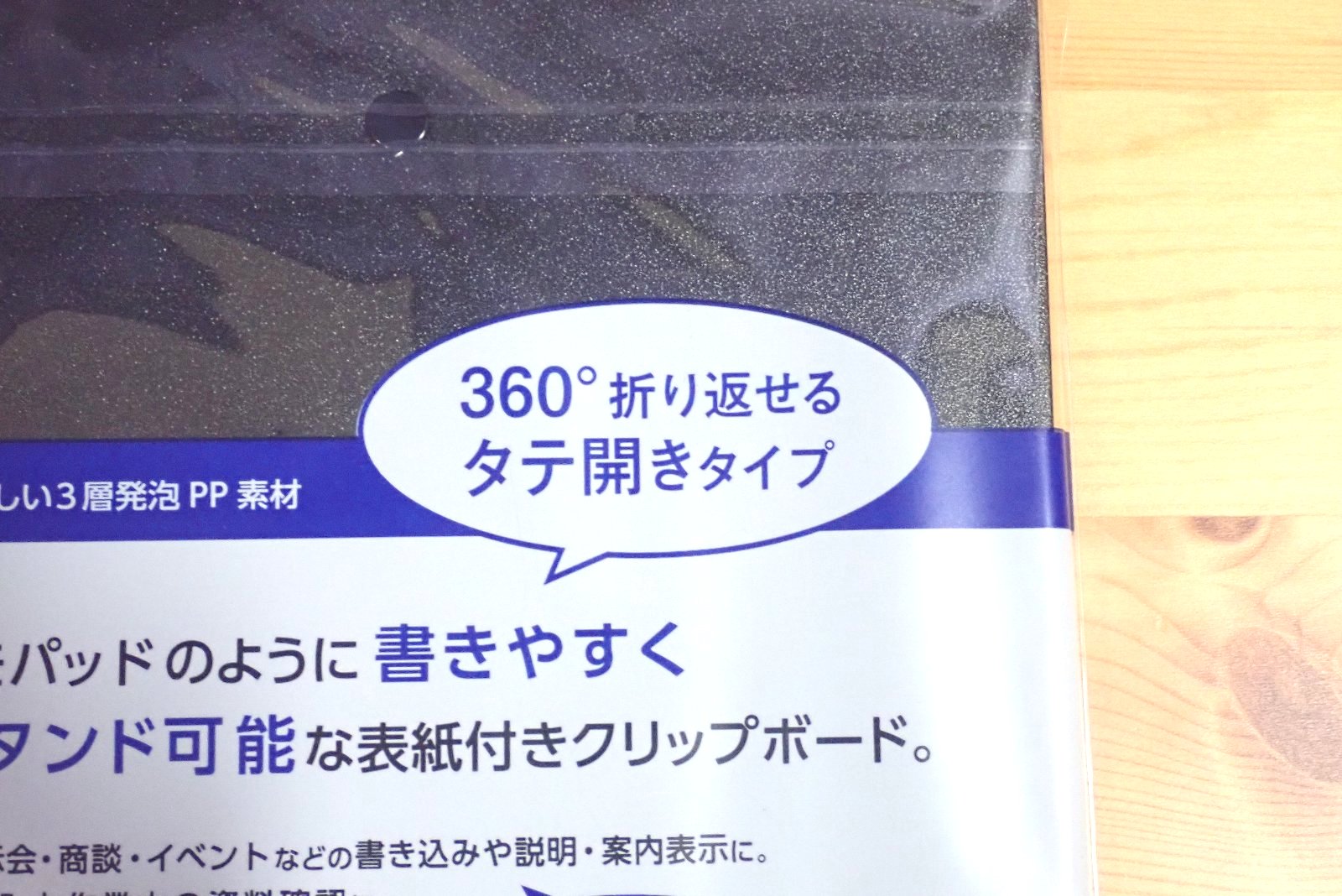 「360°折り返せるタテ開きタイプ」のクリップボードとのこと。後で紹介しますが、折り曲げる部分、溝が入っていて、綺麗、かつスムーズに360°折り返すことができます。