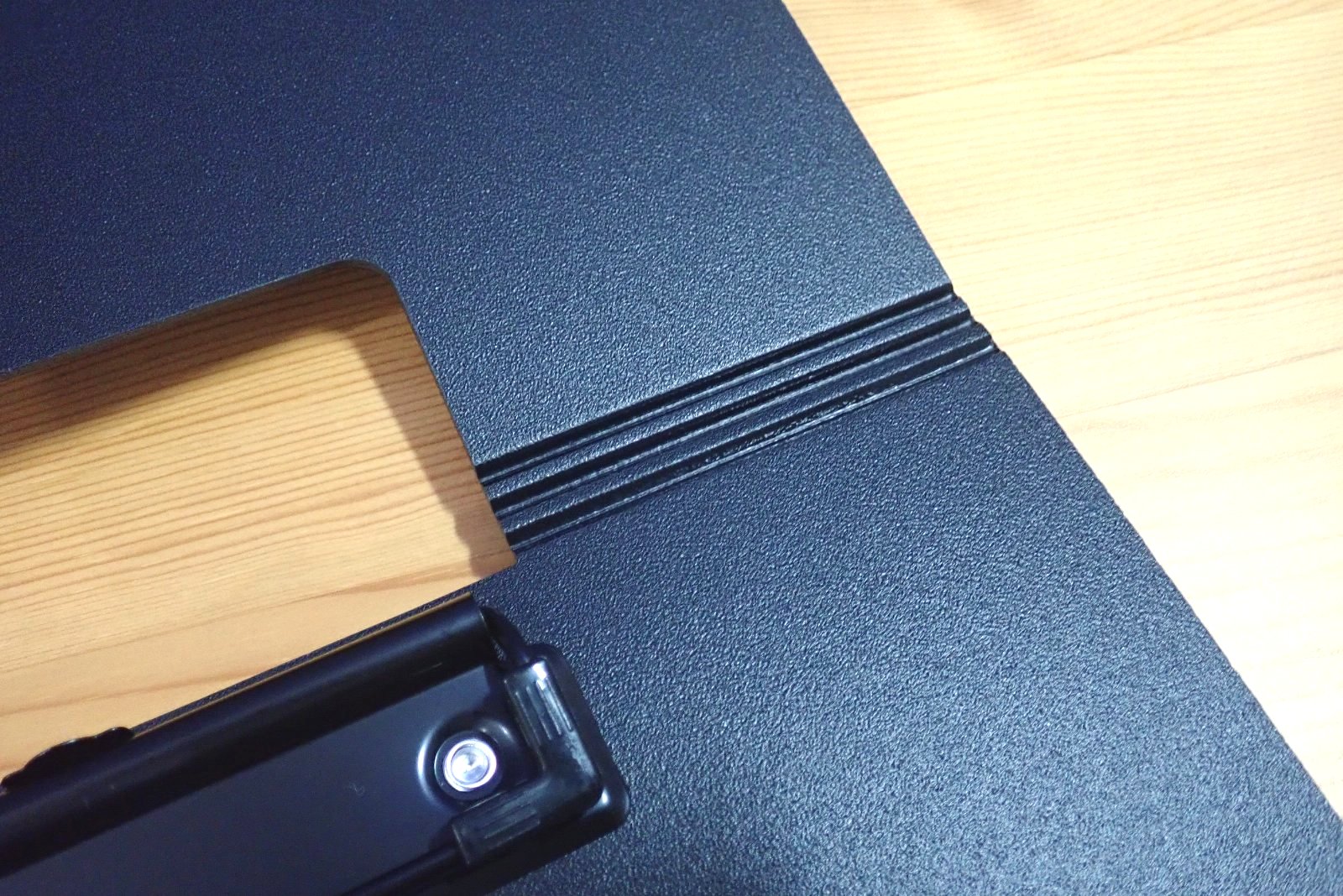 カバー部分がスムーズに開く秘密はこの部分にあります。ジョイント相当の部分に、3本の溝があり、これによってスムーズ、かつ安定したカバー開閉動作を実現しています。