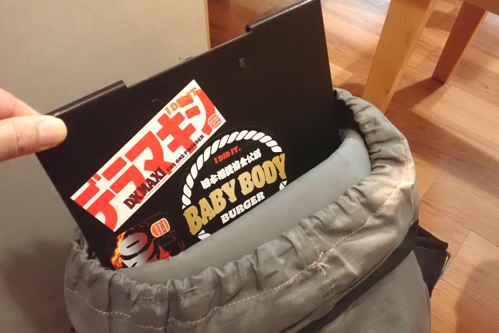 というわけで、早速、ステッカーを色々貼ってカスタマイズ(本当は、これが一番の目的)してみました。そいsて、バッグのノートPCポケットへするっと…。