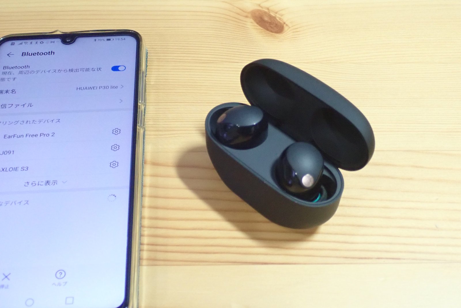初めて他の機器とペアリングするので、ケースを開き、イヤホンを取り出すだけでペアリング待ち状態になります。イヤホン(ヘッドセット)を取り出すのをお忘れなく。